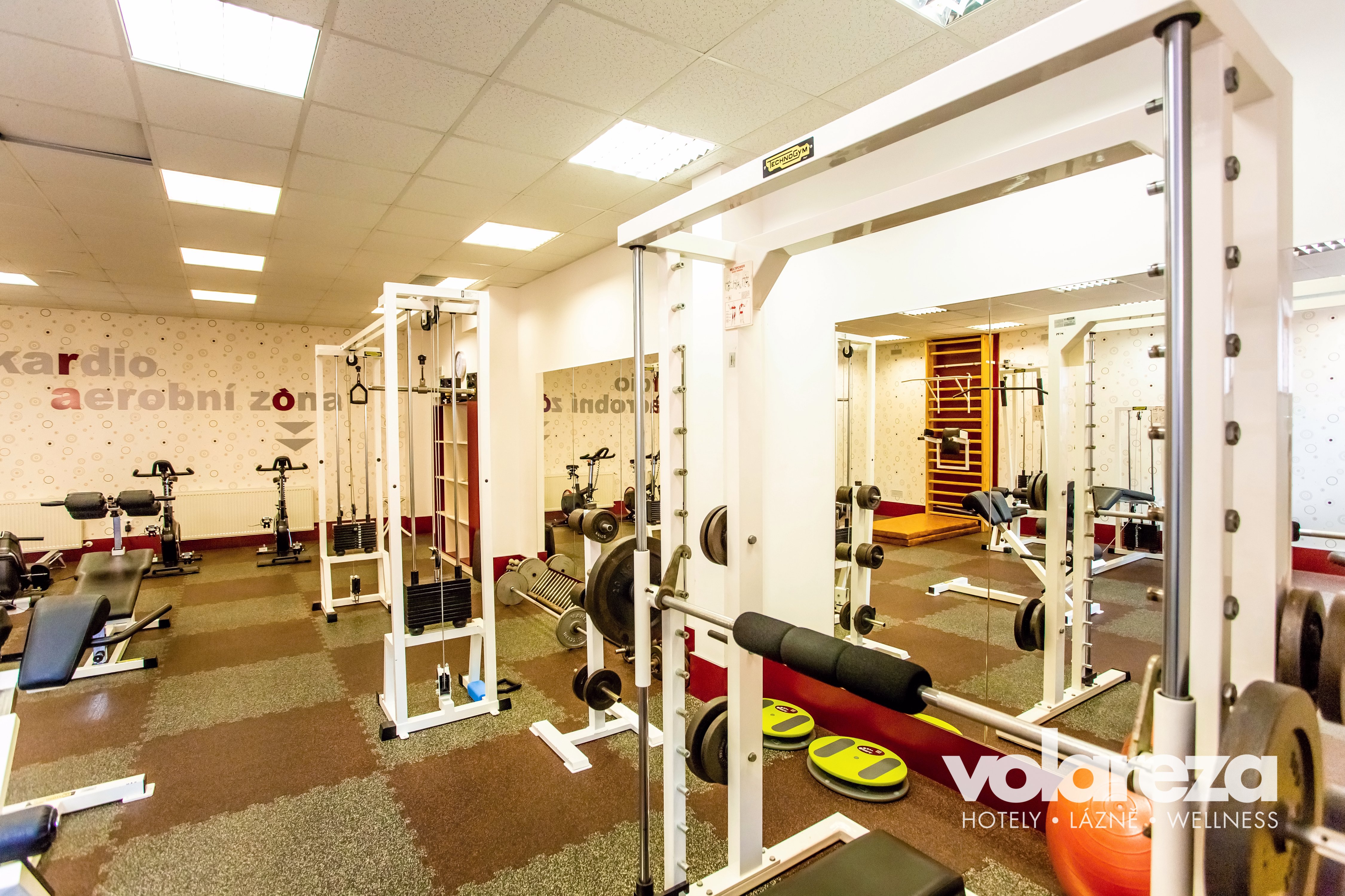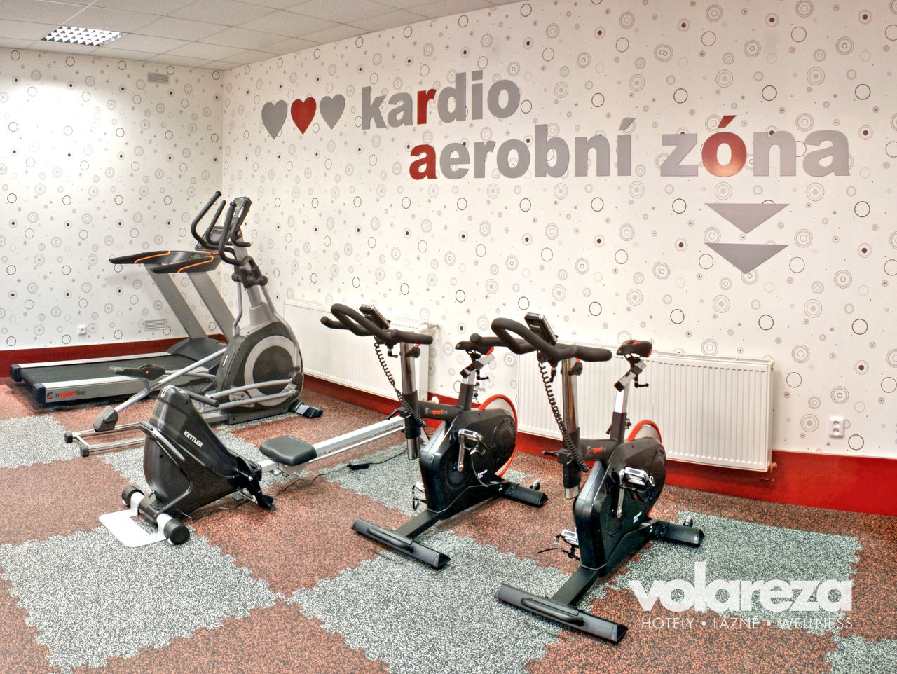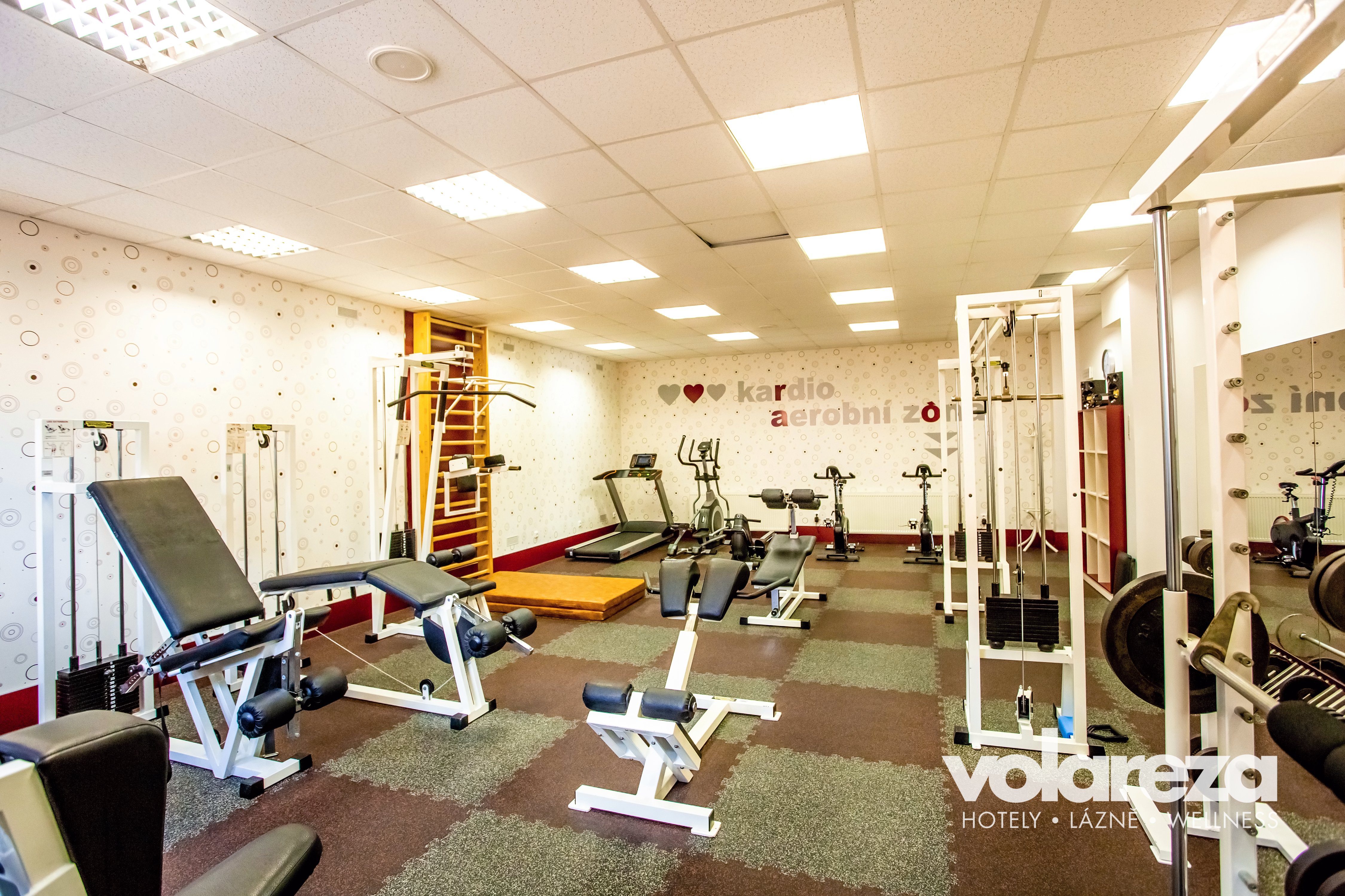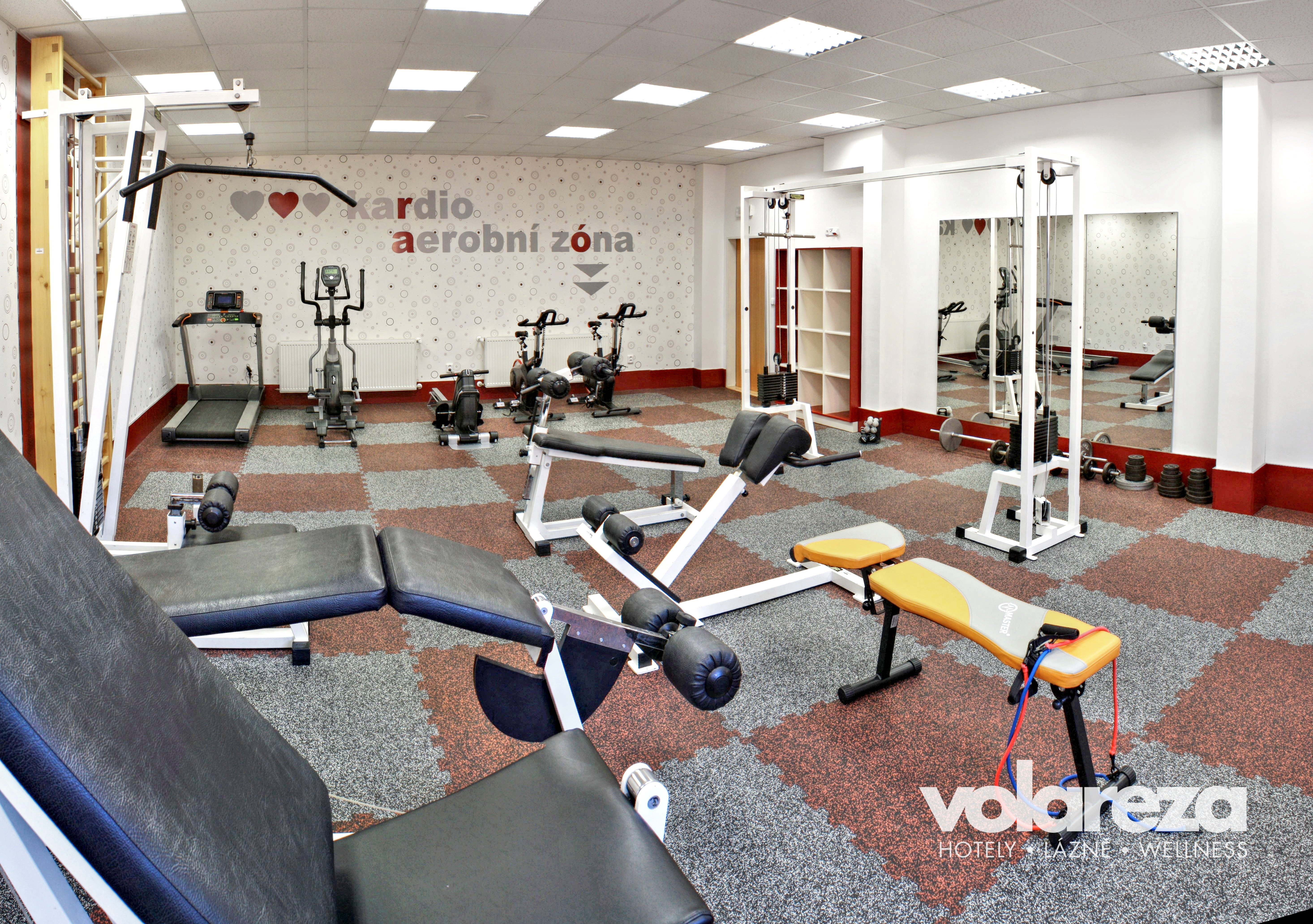 Finesszentrum mit einem breiten Angebot von Geräten – Standfahrrad, Rudersimulator, Verstärkmachine und Bänke.